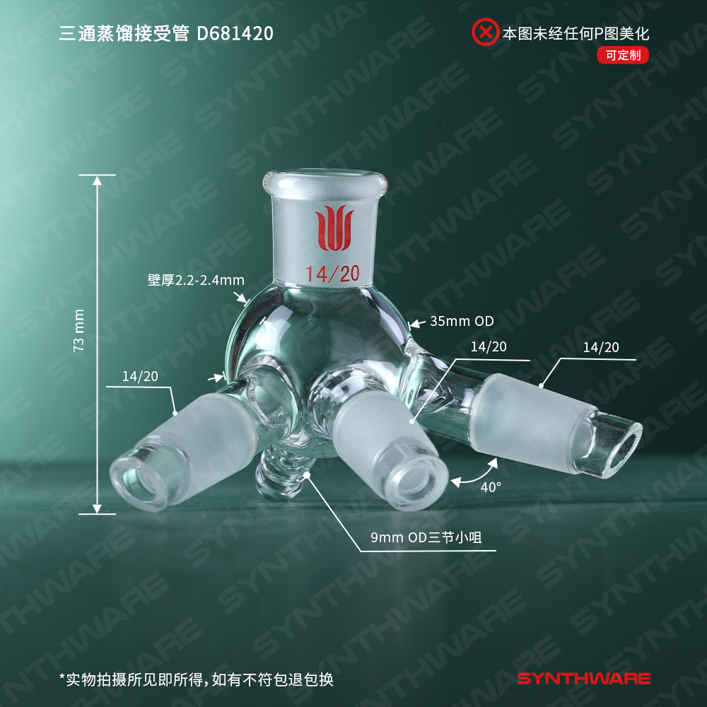 75°蒸馏头,上磨口:14/20,下磨口:14/20,侧磨口:14/20 A351420