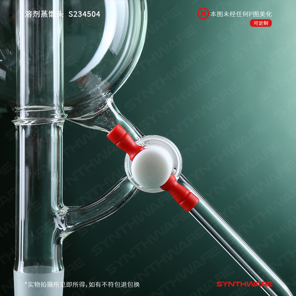 该装置应与冷凝管(上面)及两口球瓶(下面)相连接。右上侧为带四氟节门(4mm)的14/20磨口,用于注射器取液体,右下侧为出口(不带磨口),用于大量取液。