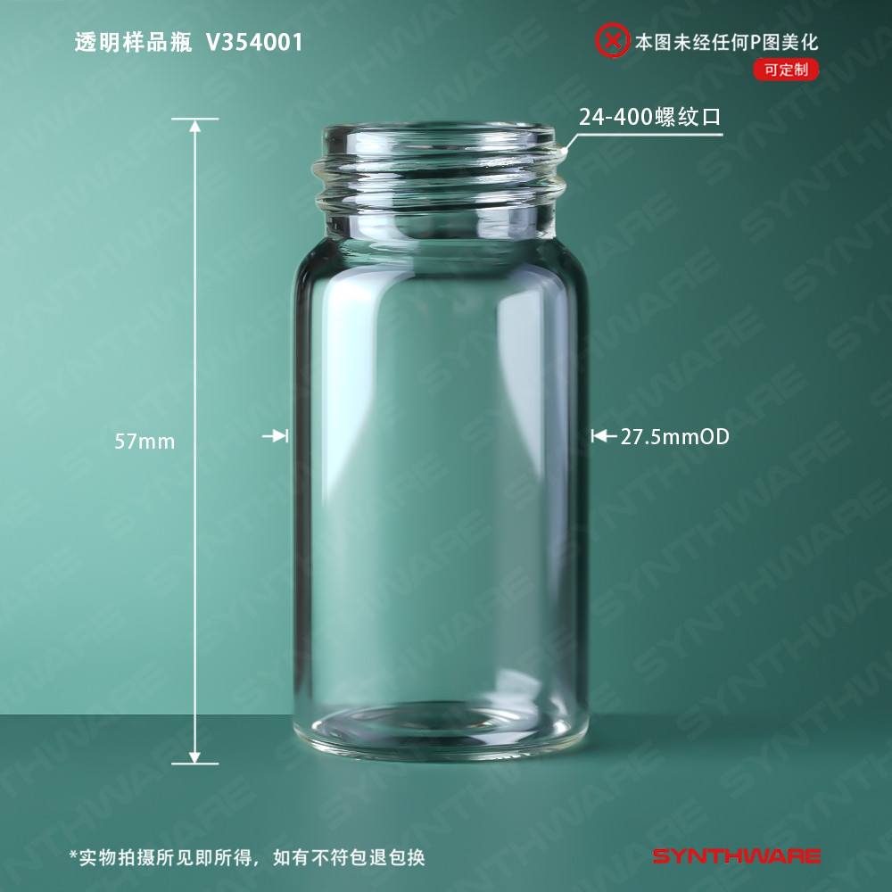 样品瓶,20ml,20-400螺纹口,27.5*57mm 普料透明玻璃,10个/包 V702420-10