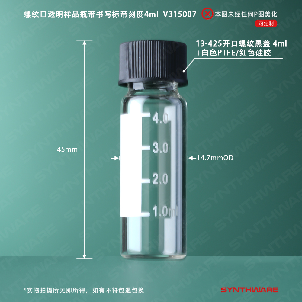 螺纹口透明样品瓶4ml(14.7*45mm开口黑盖白色PTFE/红色硅胶)100/套 V315007