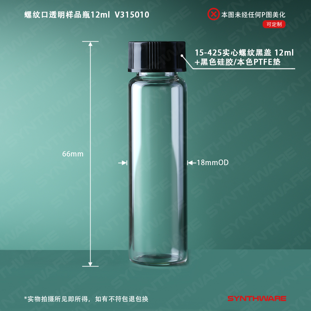 螺纹口透明样品瓶12ml(18*66mm实心黑盖硅胶/本色PTFE垫)100/套 V315010