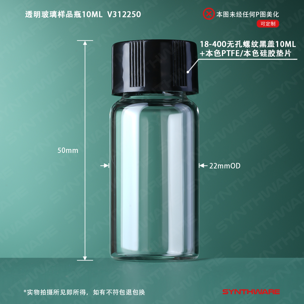 18-400螺纹10ML样品瓶套装(22*50mm样品瓶+无孔盖+本色PTFE/本色硅胶垫片)100/套 V312250