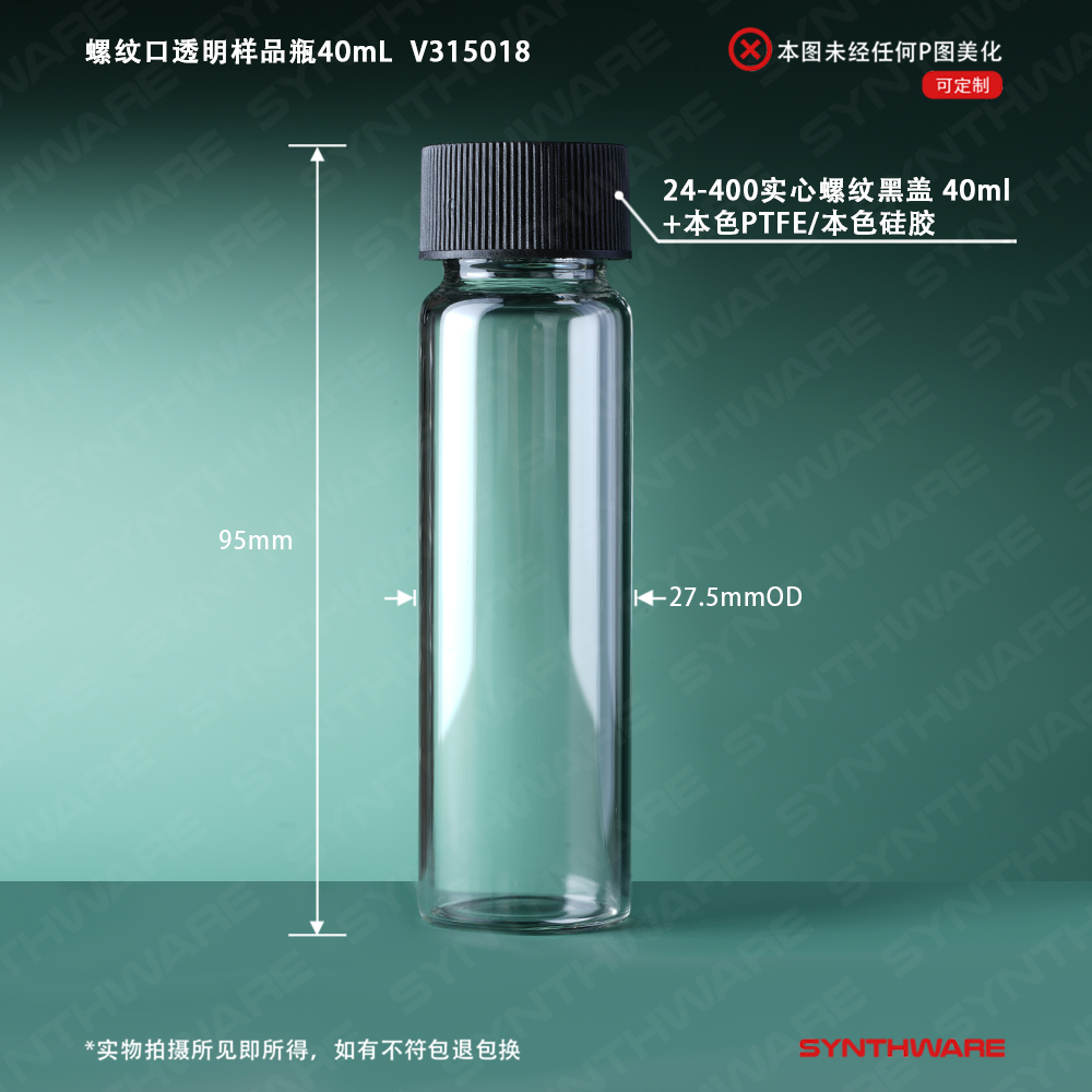螺纹口透明样品瓶40mL(27.5*95mm实心黑盖本色PTFE/本色硅胶)100/套 V315018