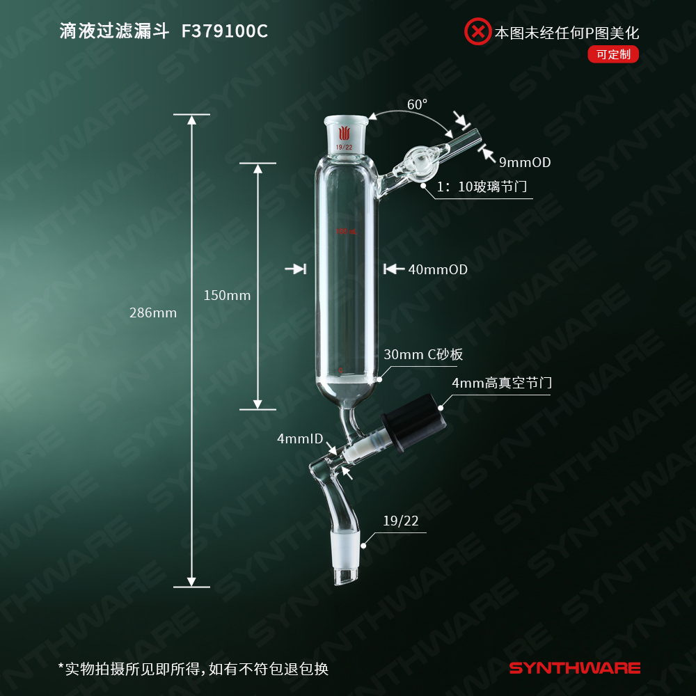 滴液过滤漏斗,过滤器4mm高真空阀,内19/22,100ml,G3 F379100M