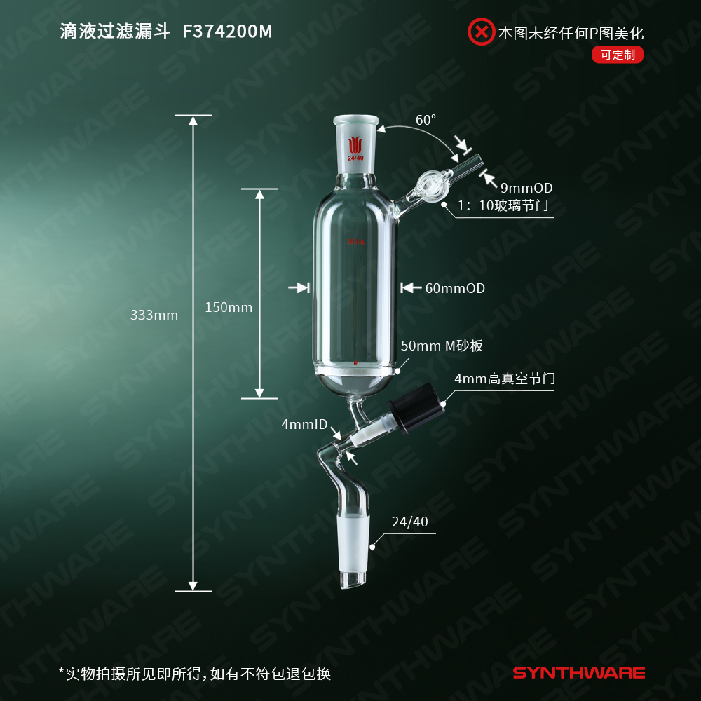 滴液过滤漏斗,过滤器4mm高真空阀,内19/22,200ml,G3 F379200M