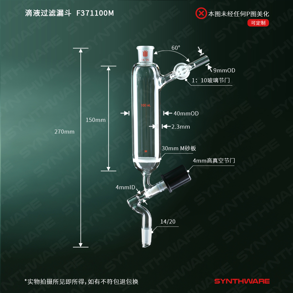 滴液过滤漏斗,过滤器4mm高真空阀,内14/20,100ml,G3 F371100M