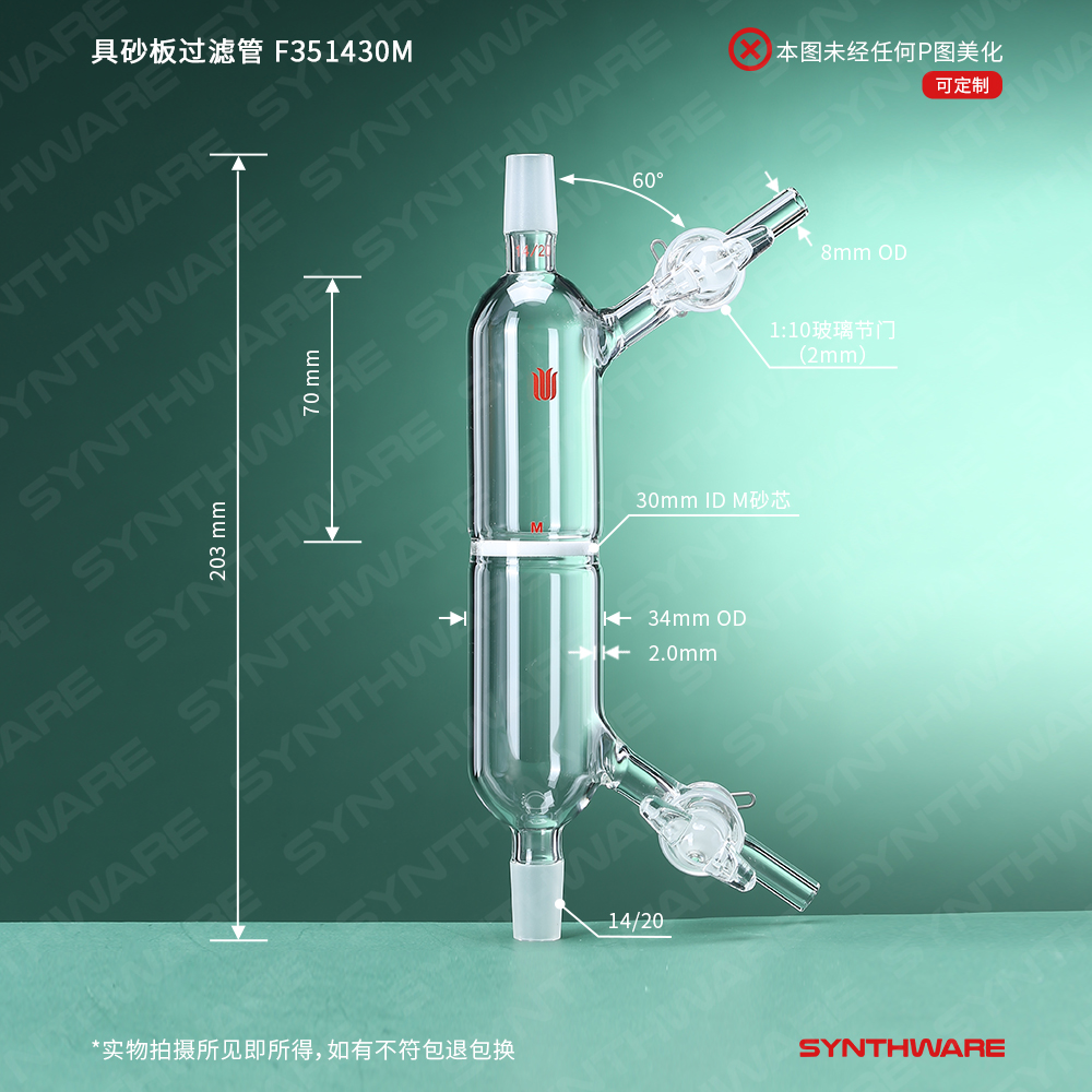 具砂板过滤管,2个玻璃节门,砂芯直径:30mm,孔隙规格:G3,磨口:14/20 F351430M