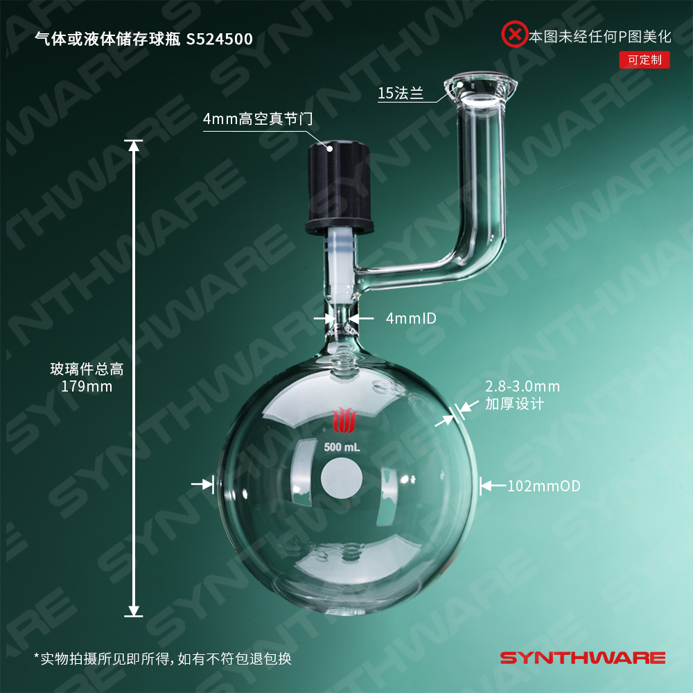 溶剂存储瓶 > 球型溶剂存储瓶 > 带砝兰口-球型溶剂存储瓶 > SYNTHWARE > 气体或液体存储球瓶,#15 O型珐琅盘,4mm高真空,容量500ml S524500