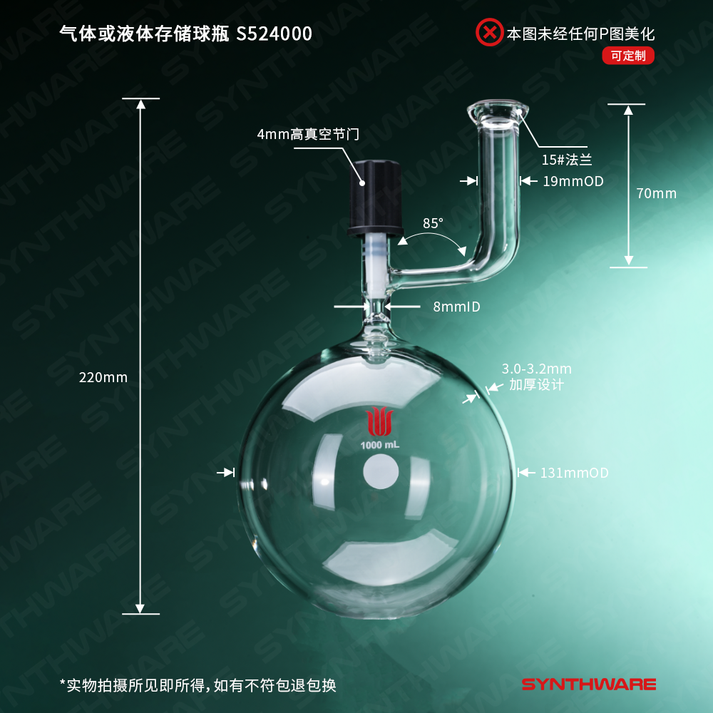 溶剂存储瓶 > 球型溶剂存储瓶 > 带砝兰口-球型溶剂存储瓶 > SYNTHWARE > 气体或液体存储球瓶,#15 O型珐琅盘,4mm高真空,容量1000ml S524000