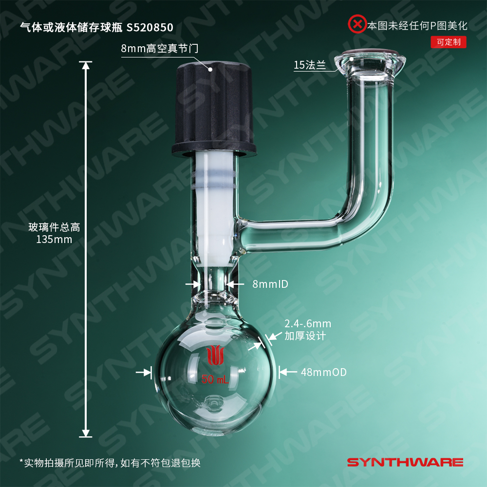 溶剂存储瓶 > 球型溶剂存储瓶 > 带砝兰口-球型溶剂存储瓶 > SYNTHWARE > 气体或液体存储球瓶,#15 O型珐琅盘,8mm高真空,容量50ml S520850