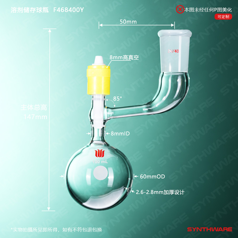 溶剂存储瓶 > 球型溶剂存储瓶 > 新型高真空-带侧口球型溶剂存储瓶 > SYNTHWARE > 溶剂储存球瓶,磨口:24/40,100ml,新型8mm高真空阀 F468400Y