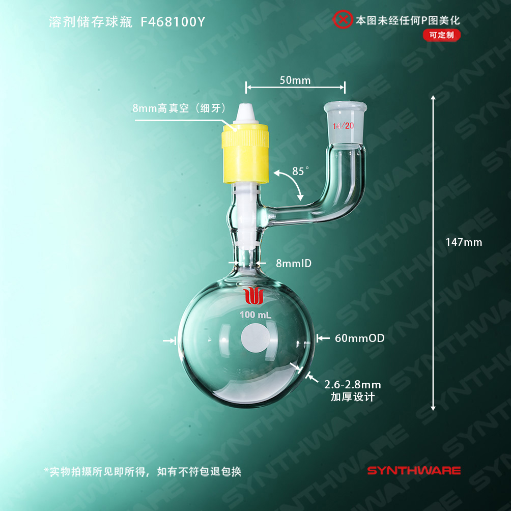 溶剂存储瓶 > 球型溶剂存储瓶 > 新型高真空-带侧口球型溶剂存储瓶 > SYNTHWARE > 溶剂储存球瓶,磨口:14/20,100ml,新型8mm高真空阀 F468100Y