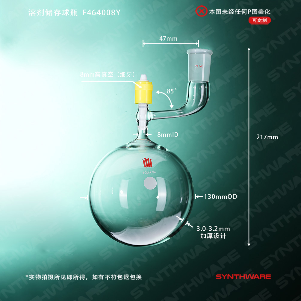 溶剂存储瓶 > 球型溶剂存储瓶 > 新型高真空-带侧口球型溶剂存储瓶 > SYNTHWARE > 溶剂储存球瓶,磨口:24/40,1000ml,新型8mm高真空阀 F464008Y