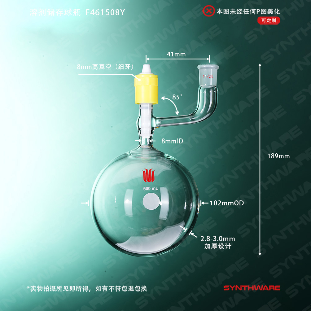 溶剂存储瓶 > 球型溶剂存储瓶 > 新型高真空-带侧口球型溶剂存储瓶 > SYNTHWARE > 溶剂储存球瓶,磨口:14/20,500ml,新型8mm高真空阀 F461508Y