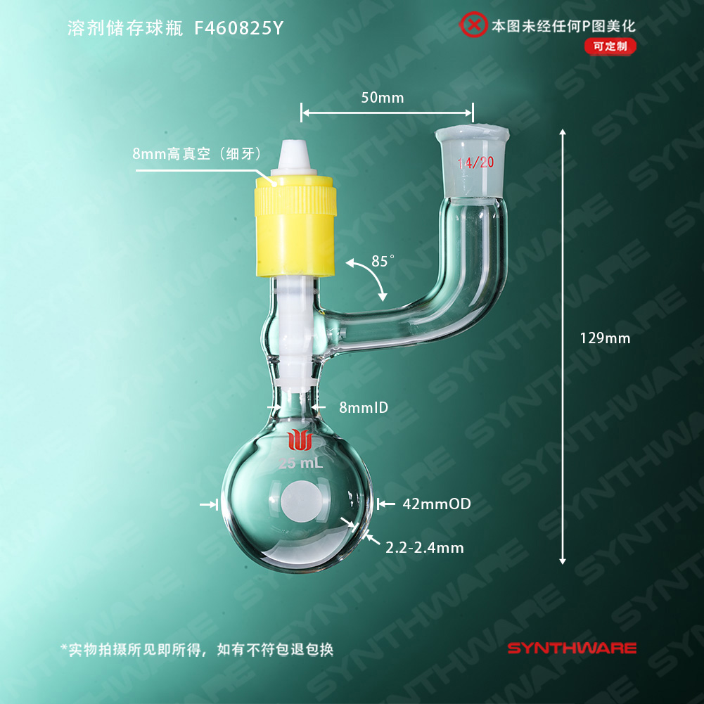 溶剂存储瓶 > 球型溶剂存储瓶 > 新型高真空-带侧口球型溶剂存储瓶 > SYNTHWARE > 溶剂储存球瓶,磨口:14/20,25ml,新型8mm高真空阀 F460825Y
