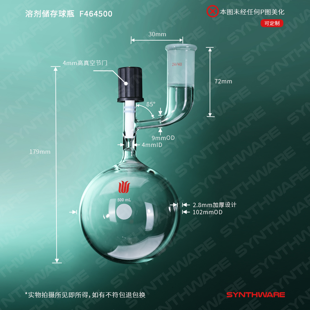 溶剂存储瓶 > 球型溶剂存储瓶 > 带侧口球型溶剂存储瓶 > SYNTHWARE > 溶剂储存球瓶,内磨口,24/40,500ml,0-4mm高真空阀 F464500