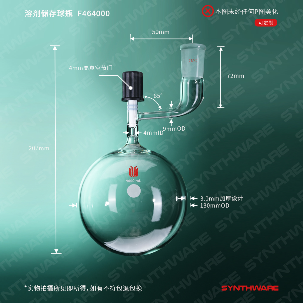 溶剂存储瓶 > 球型溶剂存储瓶 > 带侧口球型溶剂存储瓶 > SYNTHWARE > 溶剂储存球瓶,内磨口,24/40,1000ml,4mm高真空阀 F464000