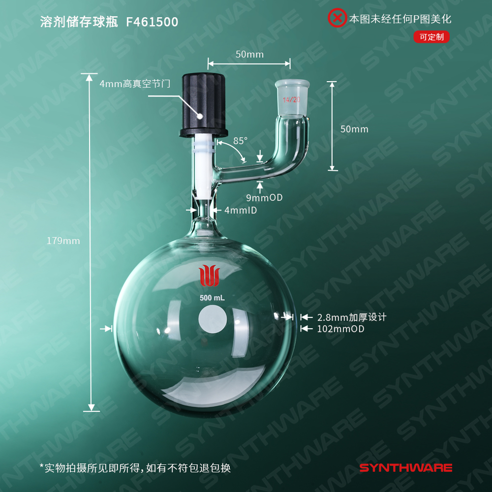 溶剂存储瓶 > 球型溶剂存储瓶 > 带侧口球型溶剂存储瓶 > SYNTHWARE > 溶剂储存球瓶,内磨口,14/20,500ml,4mm高真空阀 F461500