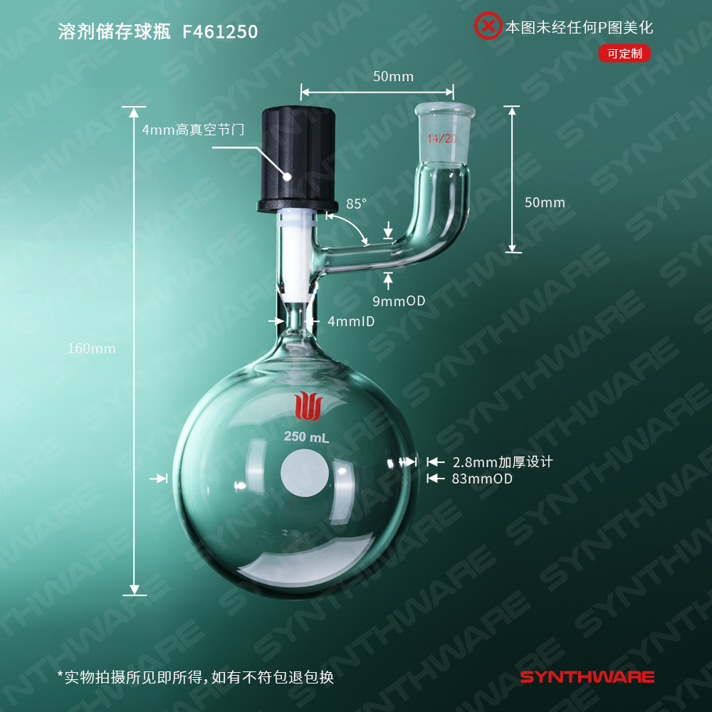 溶剂存储瓶 > 球型溶剂存储瓶 > 带侧口球型溶剂存储瓶 > SYNTHWARE > 溶剂储存球瓶,内磨口,14/20,250ml,4mm高真空阀 F461250