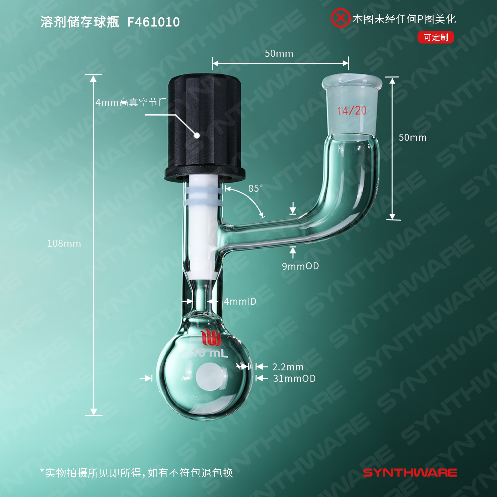 溶剂存储瓶 > 球型溶剂存储瓶 > 带侧口球型溶剂存储瓶 > SYNTHWARE > 溶剂储存球瓶,内磨口,14/20,10ml,4mm高真空阀 F461010
