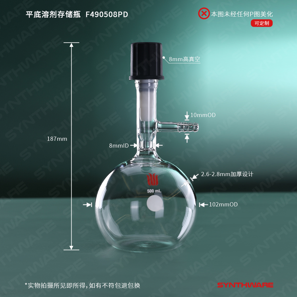 溶剂存储瓶 > 球型溶剂存储瓶 > 高真空节门-平底球溶剂存储瓶 > SYNTHWARE > 平底溶剂存储瓶,8mm高真空阀,500ml F490508PD