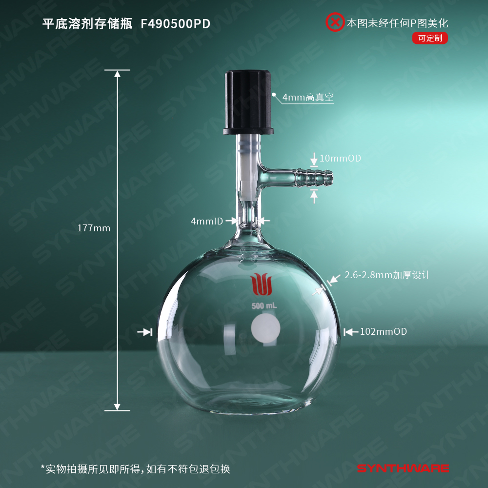 溶剂存储瓶 > 球型溶剂存储瓶 > 高真空节门-平底球溶剂存储瓶 > SYNTHWARE > 平底溶剂存储瓶,4mm高真空阀,500ml F490500PD