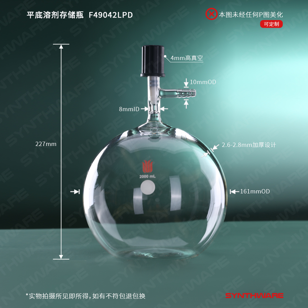 溶剂存储瓶 > 球型溶剂存储瓶 > 高真空节门-平底球溶剂存储瓶 > SYNTHWARE > 平底溶剂存储瓶,4mm高真空阀,2000ml F49042LPD