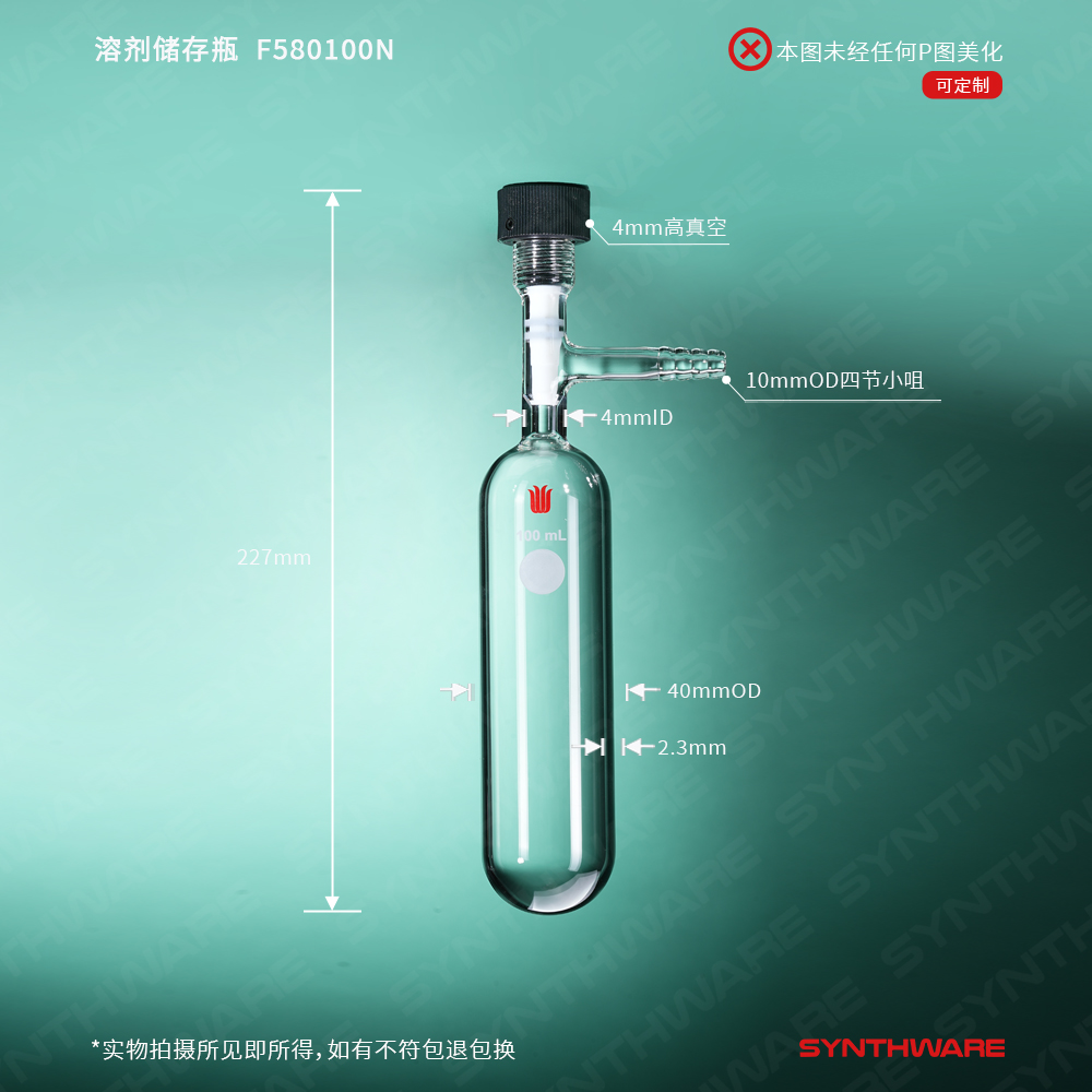 溶剂存储瓶 > 直管型溶剂存储瓶 > 内螺纹高真空节门直管溶剂存储瓶 > SYNTHWARE > 溶剂储存瓶(SCHLENK),100ml,:40×165mm,7#内螺纹0-4mm高真空 F580100N
