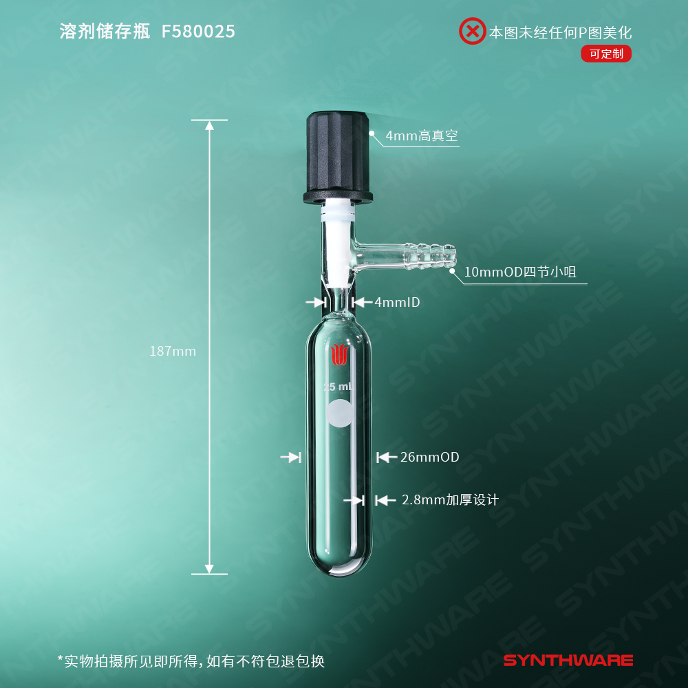 溶剂存储瓶 > 直管型溶剂存储瓶 > 高真空节门直管溶剂存储瓶 > SYNTHWARE > 溶剂储存瓶(SCHLENK),25ml,4mm高真空阀,管外径×总高:26×100mm F580025