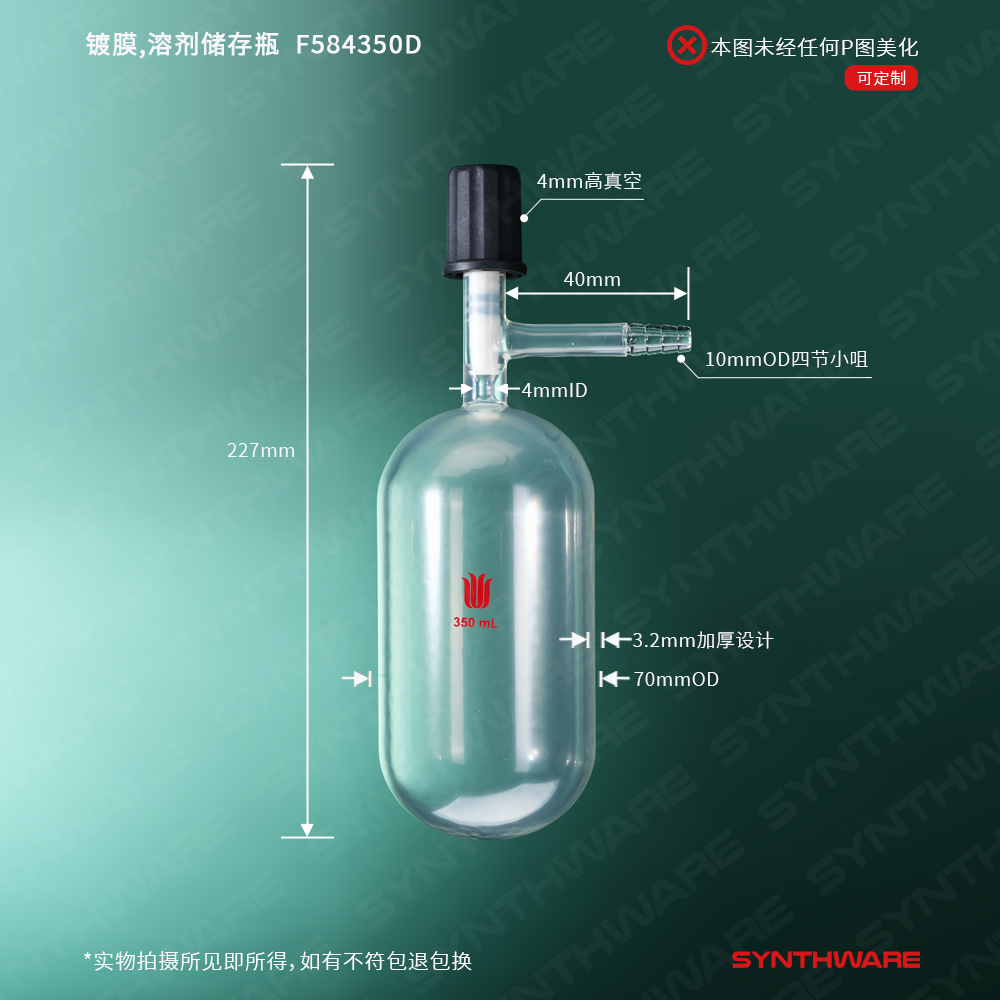 溶剂存储瓶 > 直管型溶剂存储瓶 > 镀膜-高真空节门直管溶剂存储瓶 > SYNTHWARE > 库存售完即止,溶剂储存瓶(SCHLENK),镀膜,350ml,管外径70×总高140mm,4mm高真空 F584350D