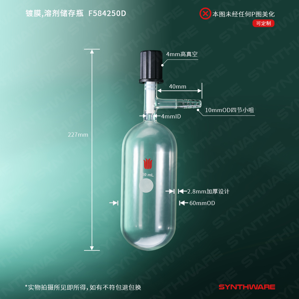 溶剂存储瓶 > 直管型溶剂存储瓶 > 镀膜-高真空节门直管溶剂存储瓶 > SYNTHWARE > 库存售完即止,溶剂储存瓶(SCHLENK),镀膜,250ml,管外径60×总高140mm,4mm高真空 F584250D