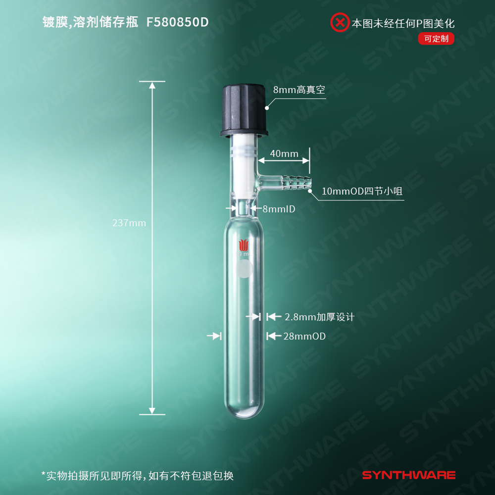 溶剂存储瓶 > 直管型溶剂存储瓶 > 镀膜-高真空节门直管溶剂存储瓶 > SYNTHWARE > 库存售完即止,溶剂储存瓶(SCHLENK),镀膜,50ml,管外径28×总高140mm,8mm高真空 F580850D
