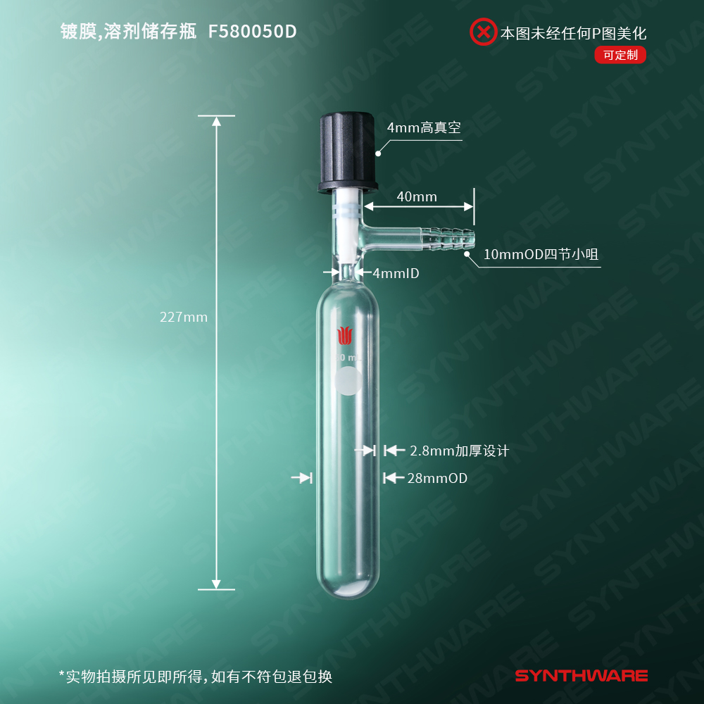 溶剂存储瓶 > 直管型溶剂存储瓶 > 镀膜-高真空节门直管溶剂存储瓶 > SYNTHWARE > 库存售完即止,溶剂储存瓶(SCHLENK),镀膜,50ml,管外径28×总高140mm,4mm高真空 F580050D