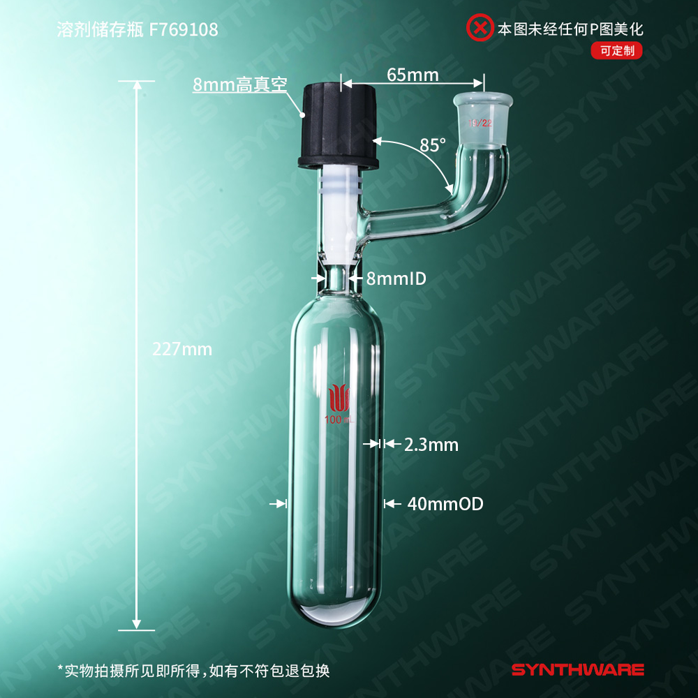 溶剂存储瓶 > 直管型溶剂存储瓶 > 带磨口直管型溶剂存储瓶 > SYNTHWARE > 溶剂储存瓶,具内磨口,19/22,100ml,8mm高真空阀,管外径*长度40mm*140mm F769108