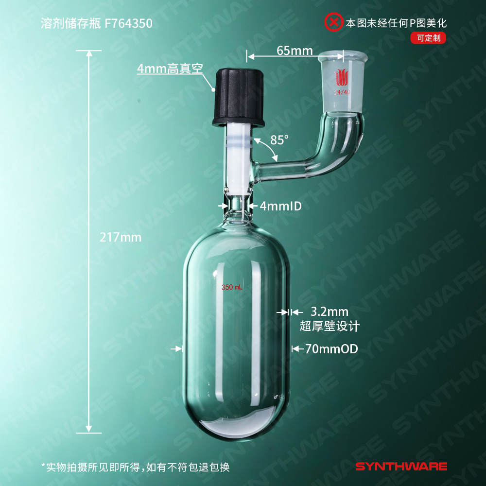 溶剂存储瓶 > 直管型溶剂存储瓶 > 带磨口直管型溶剂存储瓶 > SYNTHWARE > 溶剂储存瓶,具内磨口,24/40,350ml,4mm高真空阀,管外径*长度70mm*140mm F764350