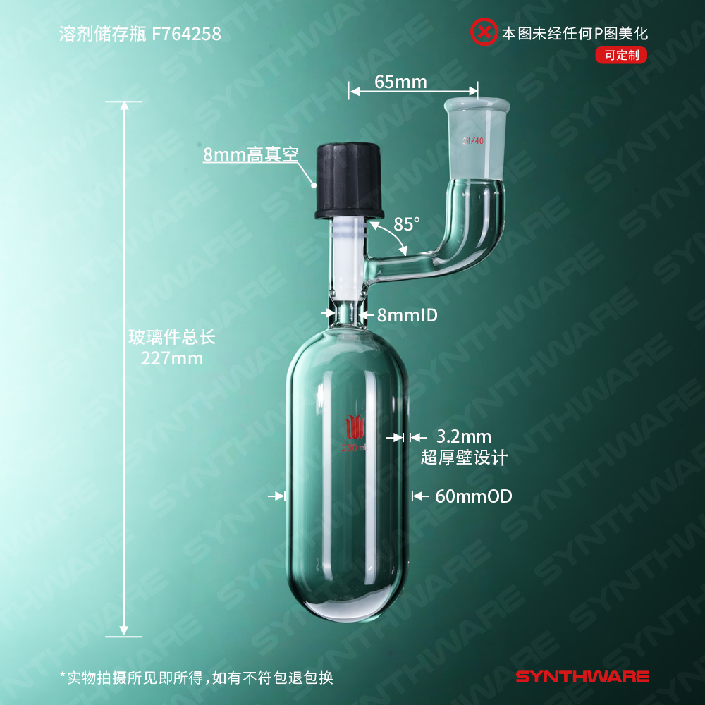 溶剂存储瓶 > 直管型溶剂存储瓶 > 带磨口直管型溶剂存储瓶 > SYNTHWARE > 溶剂储存瓶,具内磨口,24/40,250ml,8mm高真空阀,管外径*长度60mm*140mm F764258