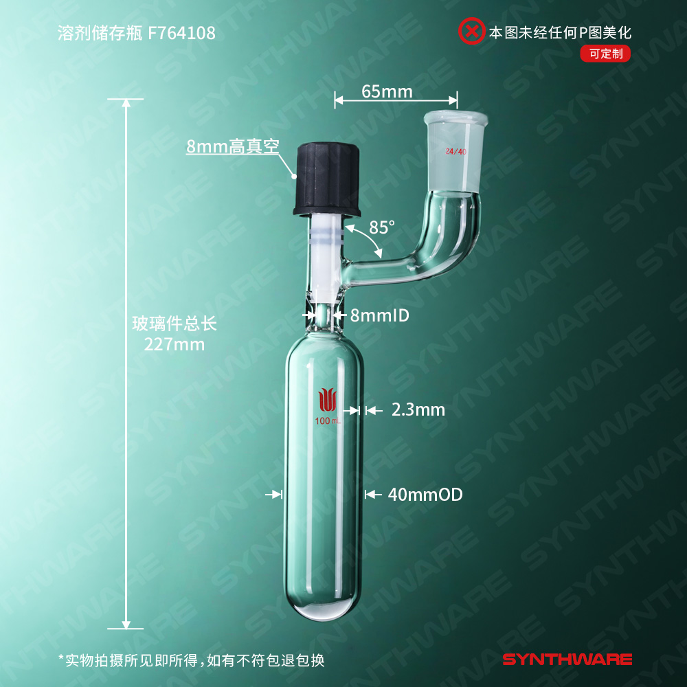 溶剂存储瓶 > 直管型溶剂存储瓶 > 带磨口直管型溶剂存储瓶 > SYNTHWARE > 溶剂储存瓶,具内磨口,24/40,100ml,8mm高真空阀,管外径*长度40mm*140mm F764108