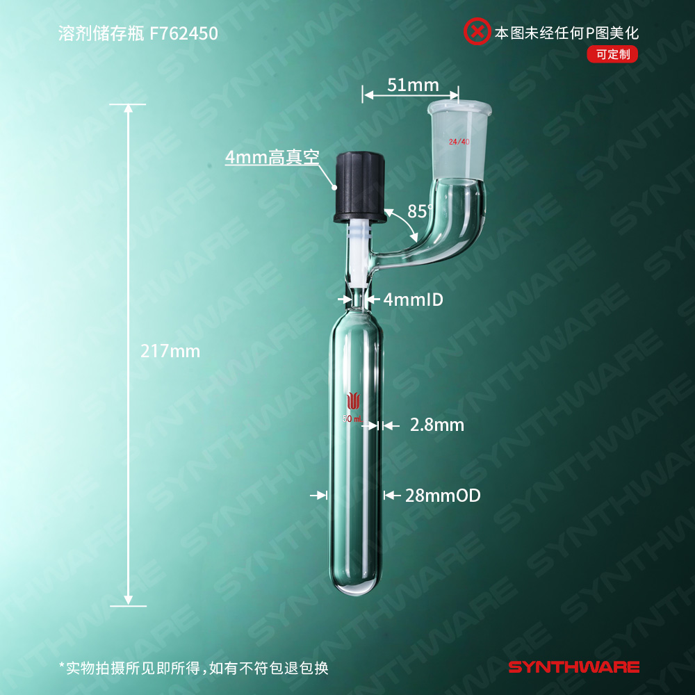 溶剂存储瓶 > 直管型溶剂存储瓶 > 带磨口直管型溶剂存储瓶 > SYNTHWARE > 溶剂储存瓶,具内磨口,24/40,50ml,4mm高真空阀,管外径*长度28mm*140mm F762450