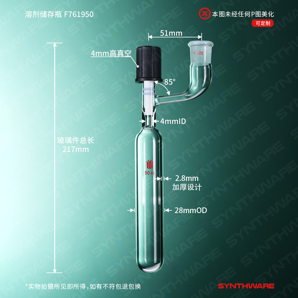 溶剂存储瓶 > 直管型溶剂存储瓶 > 带磨口直管型溶剂存储瓶 > SYNTHWARE > 溶剂储存瓶,具内磨口,19/22,50ml,4mm高真空阀,管外径*长度28mm*140mm F761950