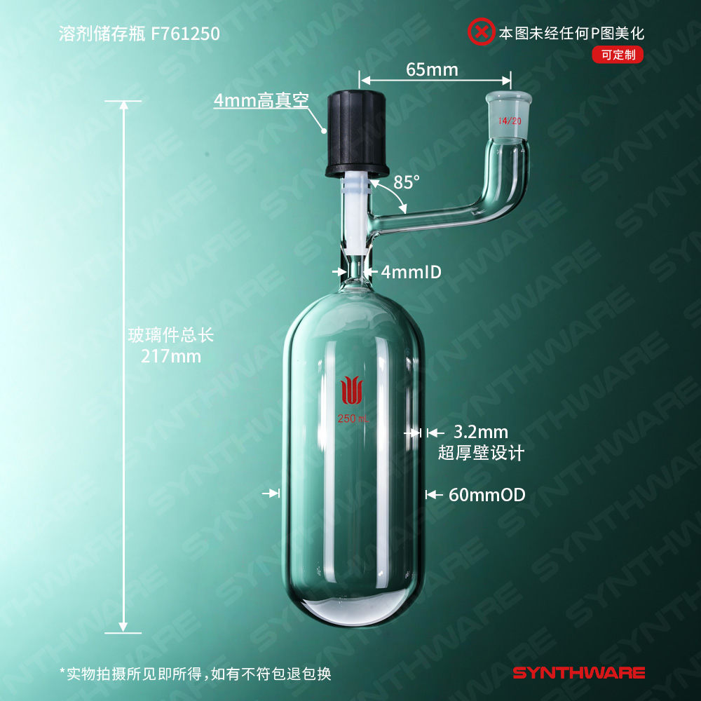 溶剂存储瓶 > 直管型溶剂存储瓶 > 带磨口直管型溶剂存储瓶 > SYNTHWARE > 溶剂储存瓶,具内磨口,14/20,250ml,4mm高真空阀,管外径*长度60mm*140mm F761250