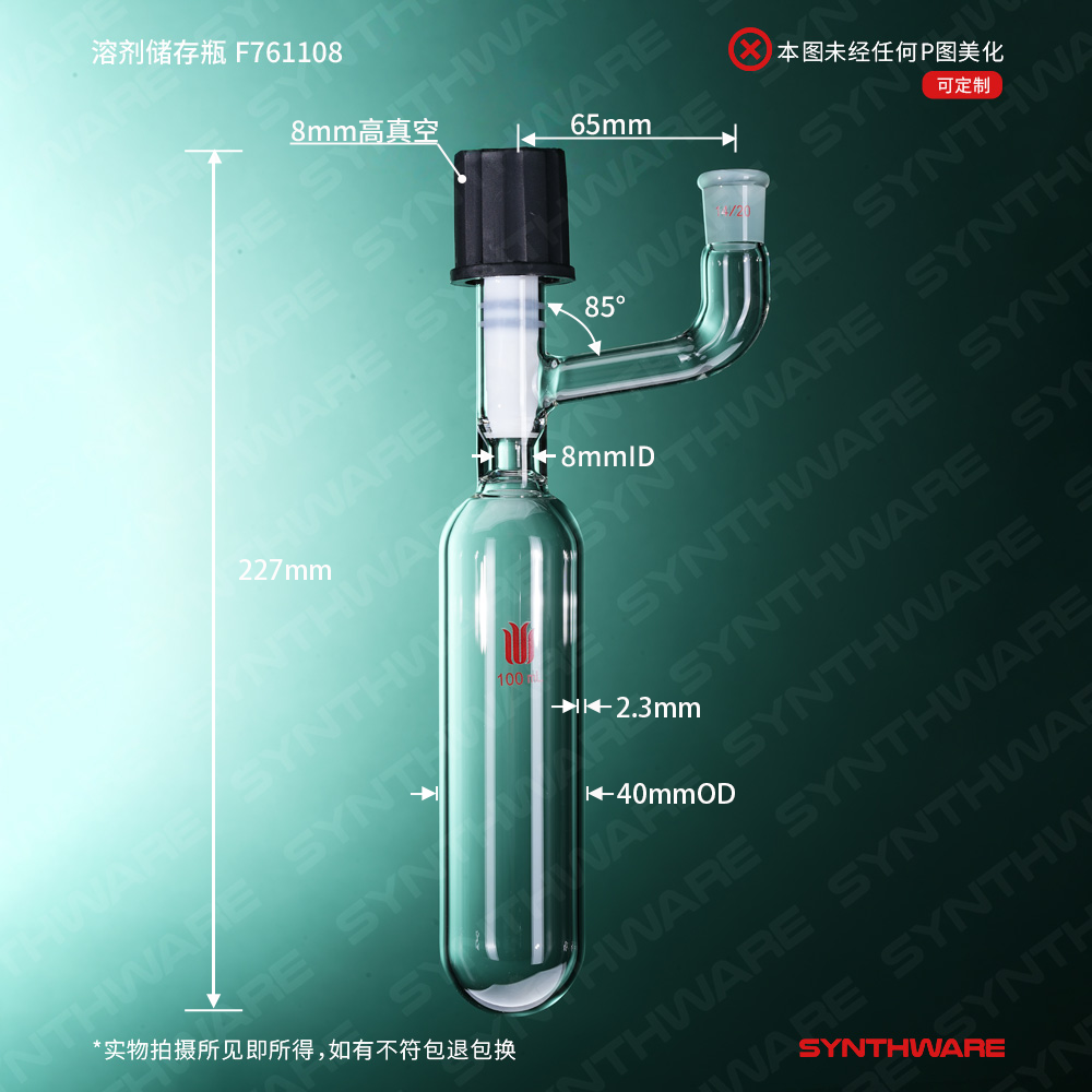 溶剂存储瓶 > 直管型溶剂存储瓶 > 带磨口直管型溶剂存储瓶 > SYNTHWARE > 溶剂储存瓶,具内磨口,14/20,100ml,8mm高真空阀,管外径*长度40mm*140mm F761108