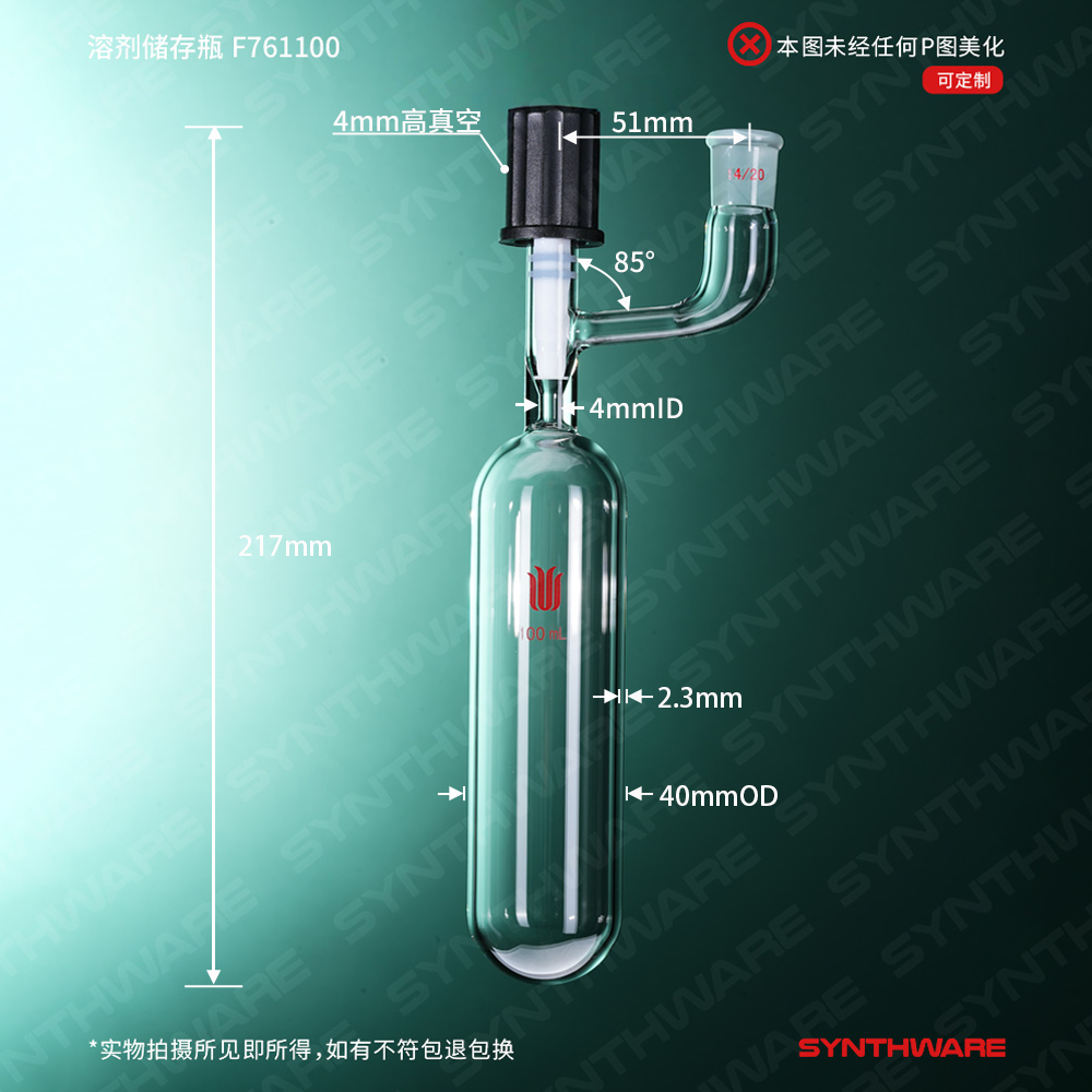 溶剂存储瓶 > 直管型溶剂存储瓶 > 带磨口直管型溶剂存储瓶 > SYNTHWARE > 溶剂储存瓶,具内磨口14/20,100ml,4mm高真空阀,管外径*长度40mm*140mm F761100