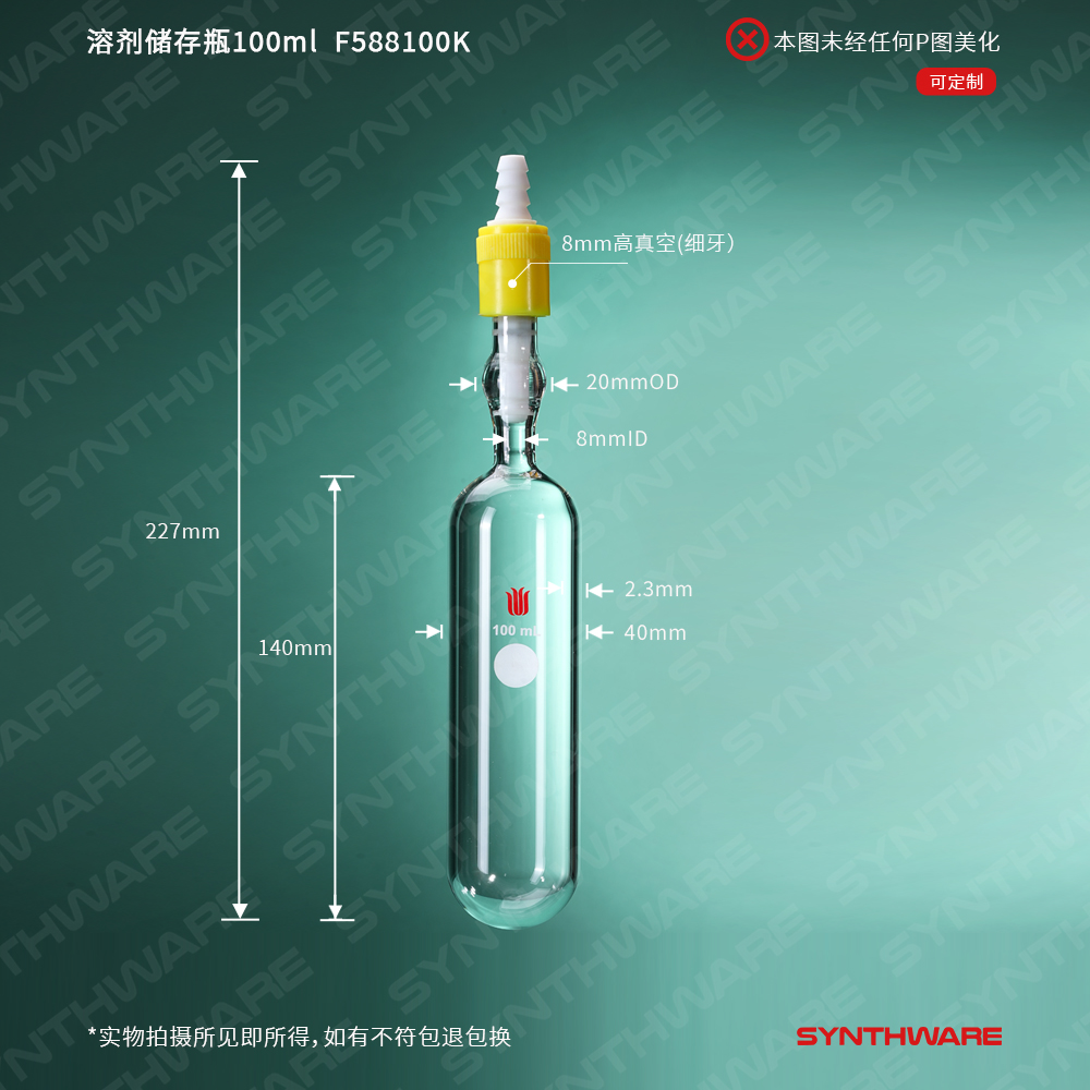 溶剂存储瓶 > 直管型溶剂存储瓶 > 带抽气孔高真空阀溶剂存储瓶 > SYNTHWARE > 溶剂储存瓶100ml,抽气高真空阀,管外径×总高:40×140mm F588100K