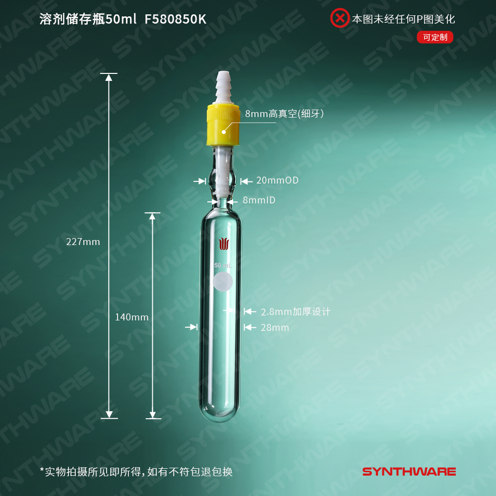 溶剂存储瓶 > 直管型溶剂存储瓶 > 带抽气孔高真空阀溶剂存储瓶 > SYNTHWARE > 溶剂储存瓶50ml,抽气高真空阀,管外径×总高:28×140mm F580850K