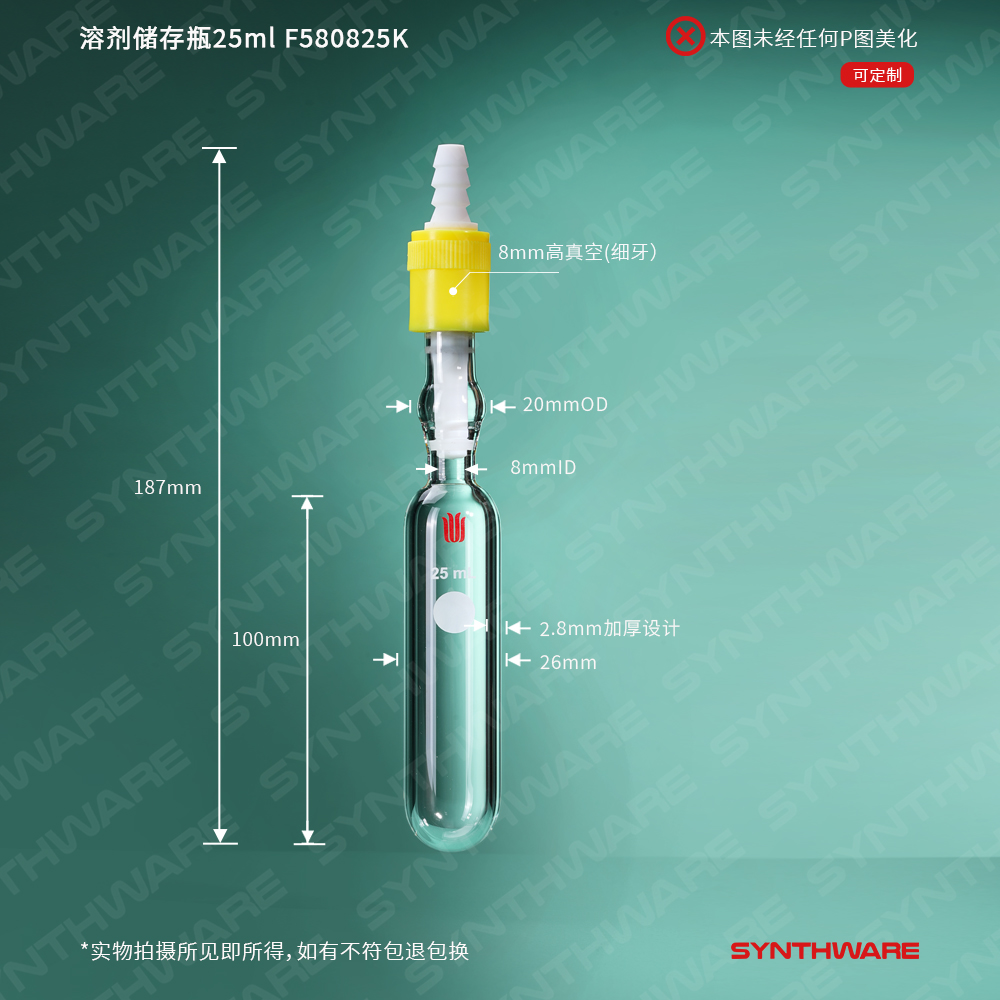 溶剂存储瓶 > 直管型溶剂存储瓶 > 带抽气孔高真空阀溶剂存储瓶 > SYNTHWARE > 溶剂储存瓶25ml,抽气高真空阀,管外径×总高:26mm×100mm F580825K