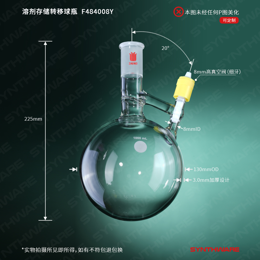 溶剂存储转移球瓶,磨口:24/40,1000ml,新型8mm高真空阀 F4842L8Y