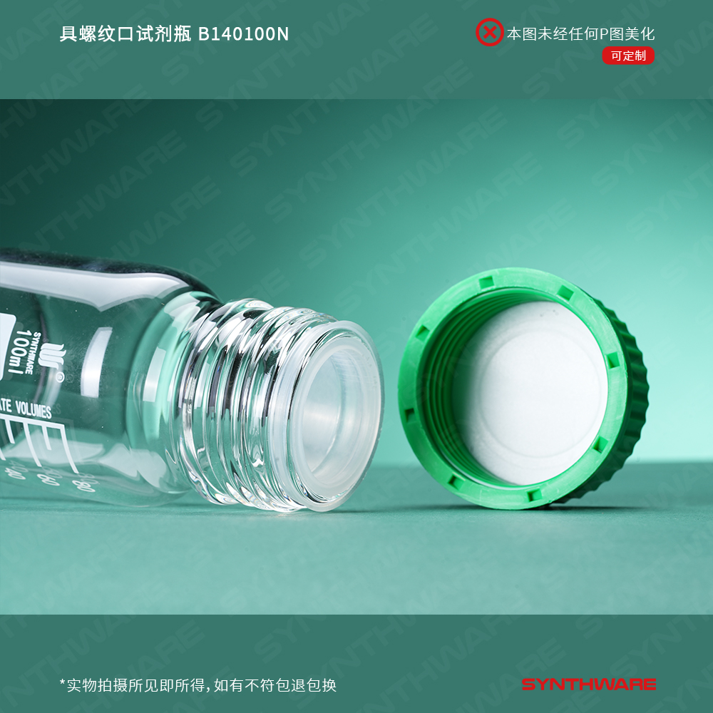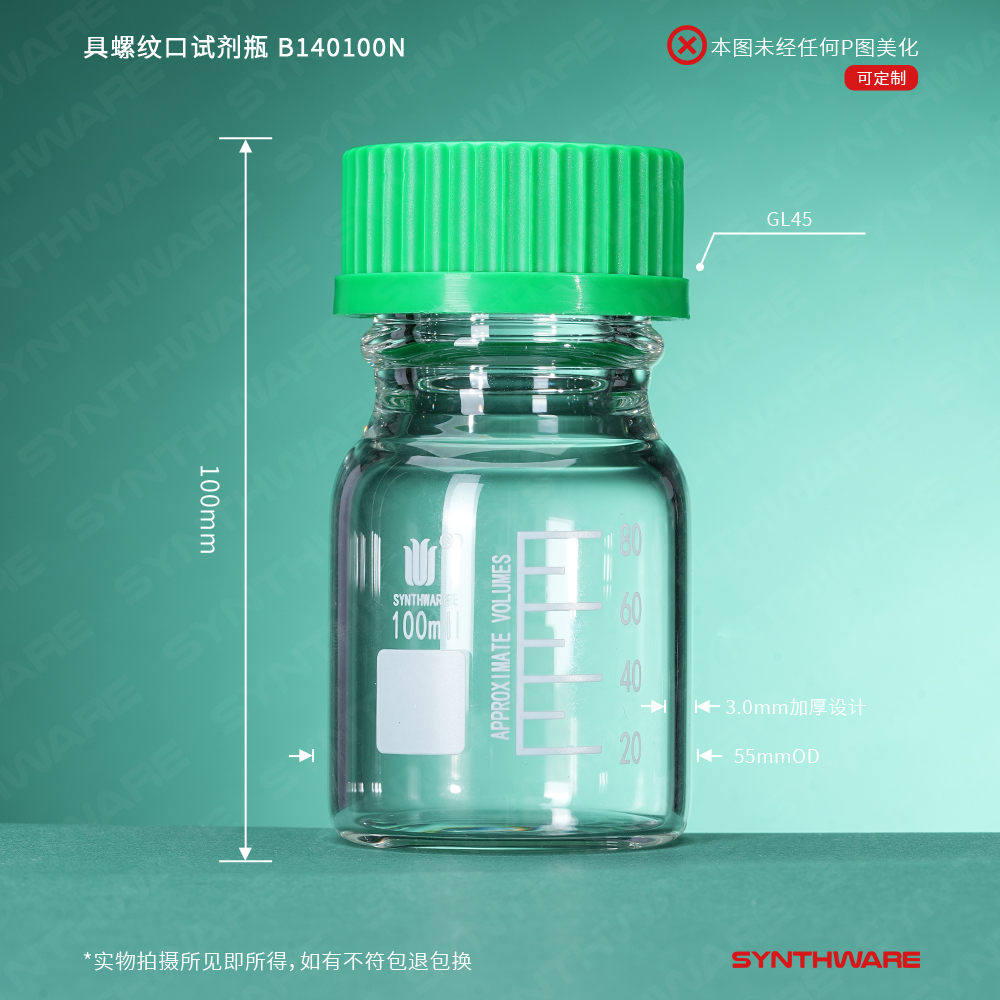 溶剂存储瓶 > 试剂瓶 > 带内扣盖试剂瓶 > SYNTHWARE > 具螺纹口试剂瓶 100ml GL45,标配尼龙盖+垫片+密封圈+内扣盖 B140100N
