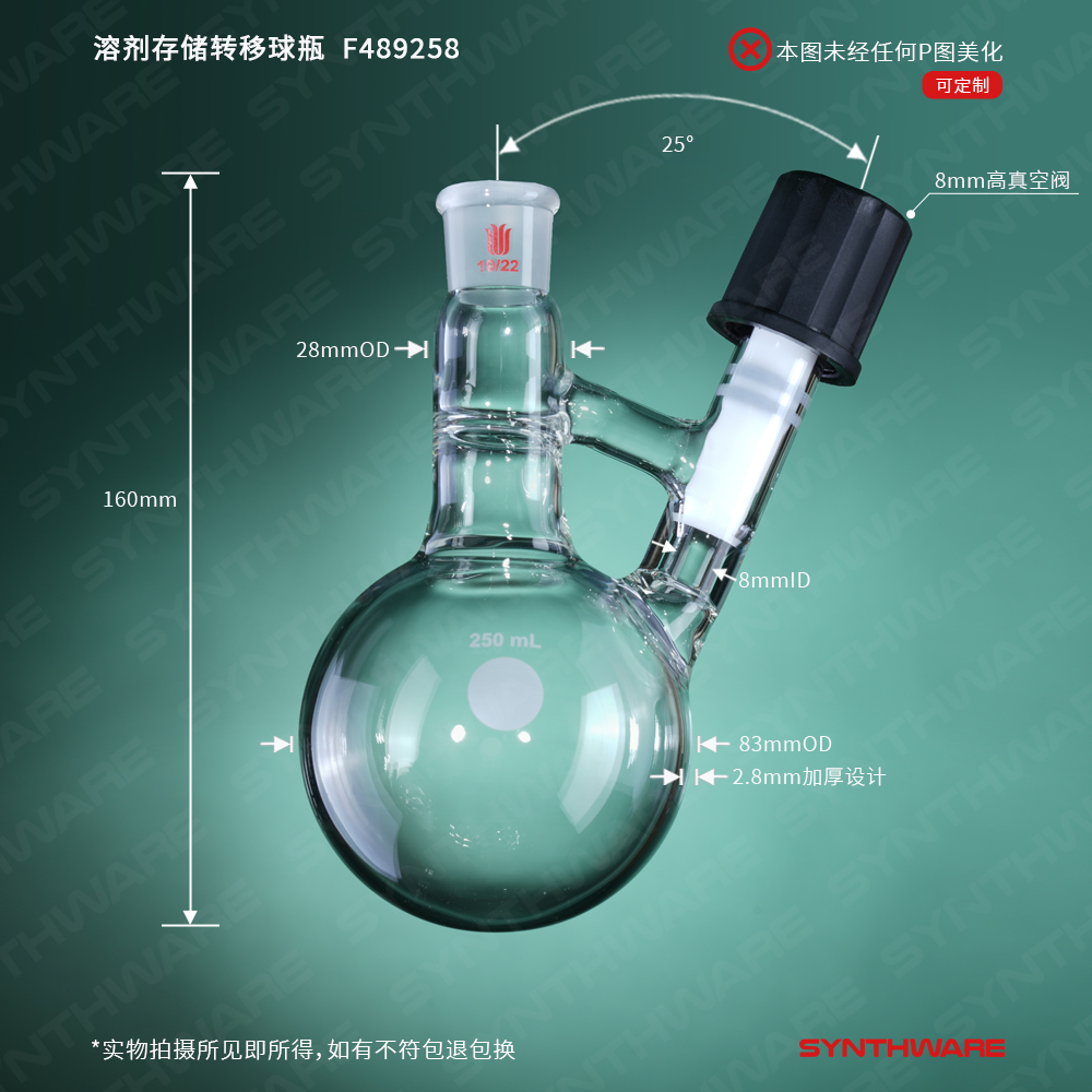 溶剂存储转移球瓶,磨口:19/22,250ml,8mm高真空阀 F489258