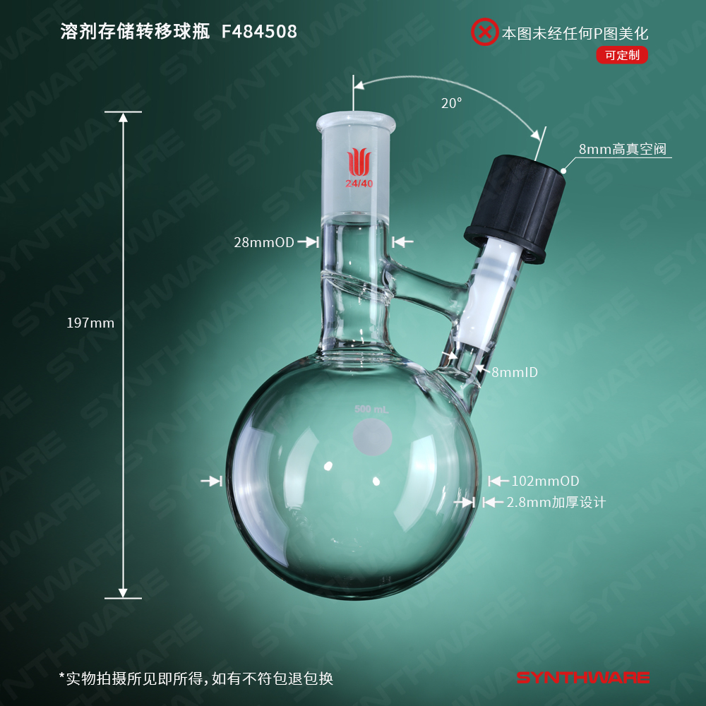 溶剂存储转移球瓶,磨口:14/20,500ml,8mm高真空阀 F481508