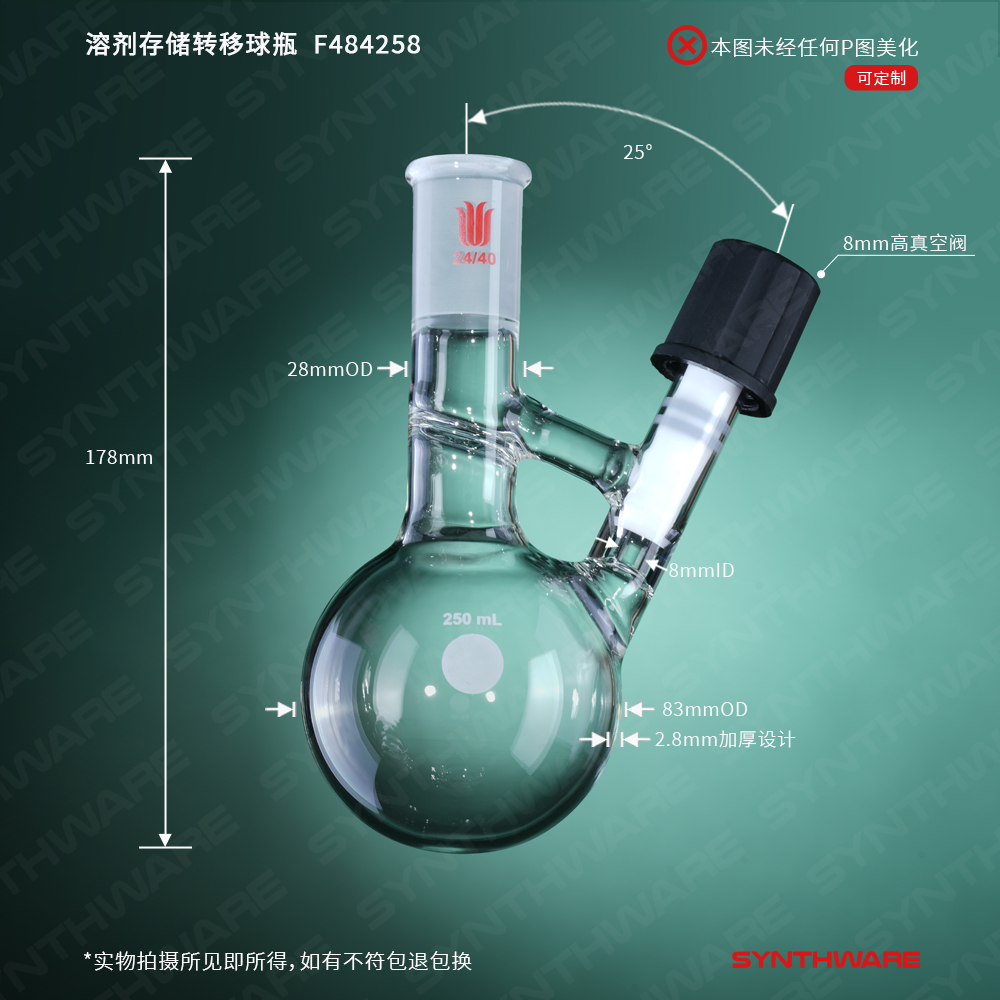溶剂存储转移球瓶,磨口:24/40,250ml,8mm高真空阀 F484258